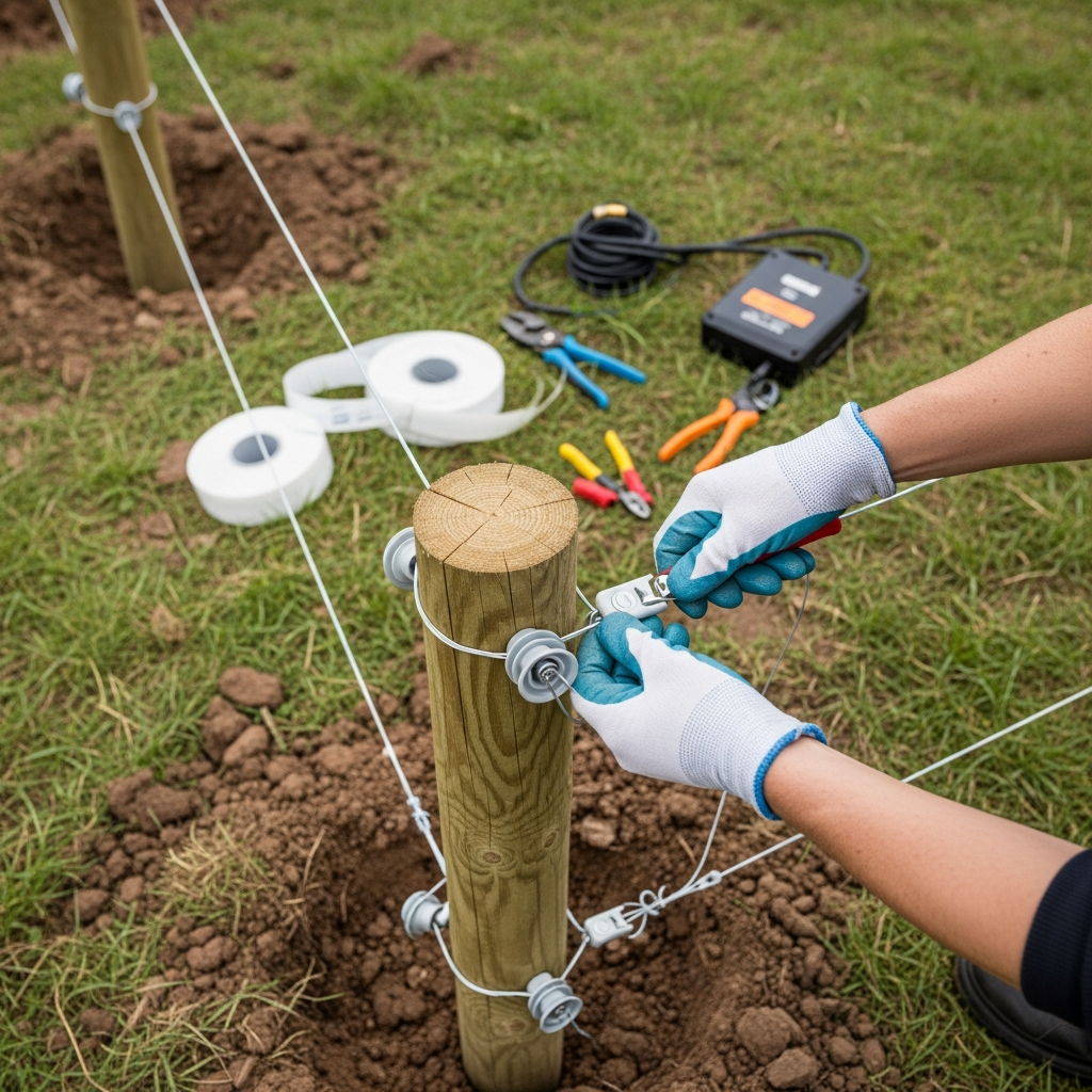 Pour les clôtures électriques, utilisez exclusivement des isolateurs prévus à cet effet : jamais de cavaliers métalliques qui créeraient des courts-circuits. Tendez progressivement le conducteur pour éviter la cassure, en commençant par fixer une extrémité puis en déroulant vers l'autre bout.
