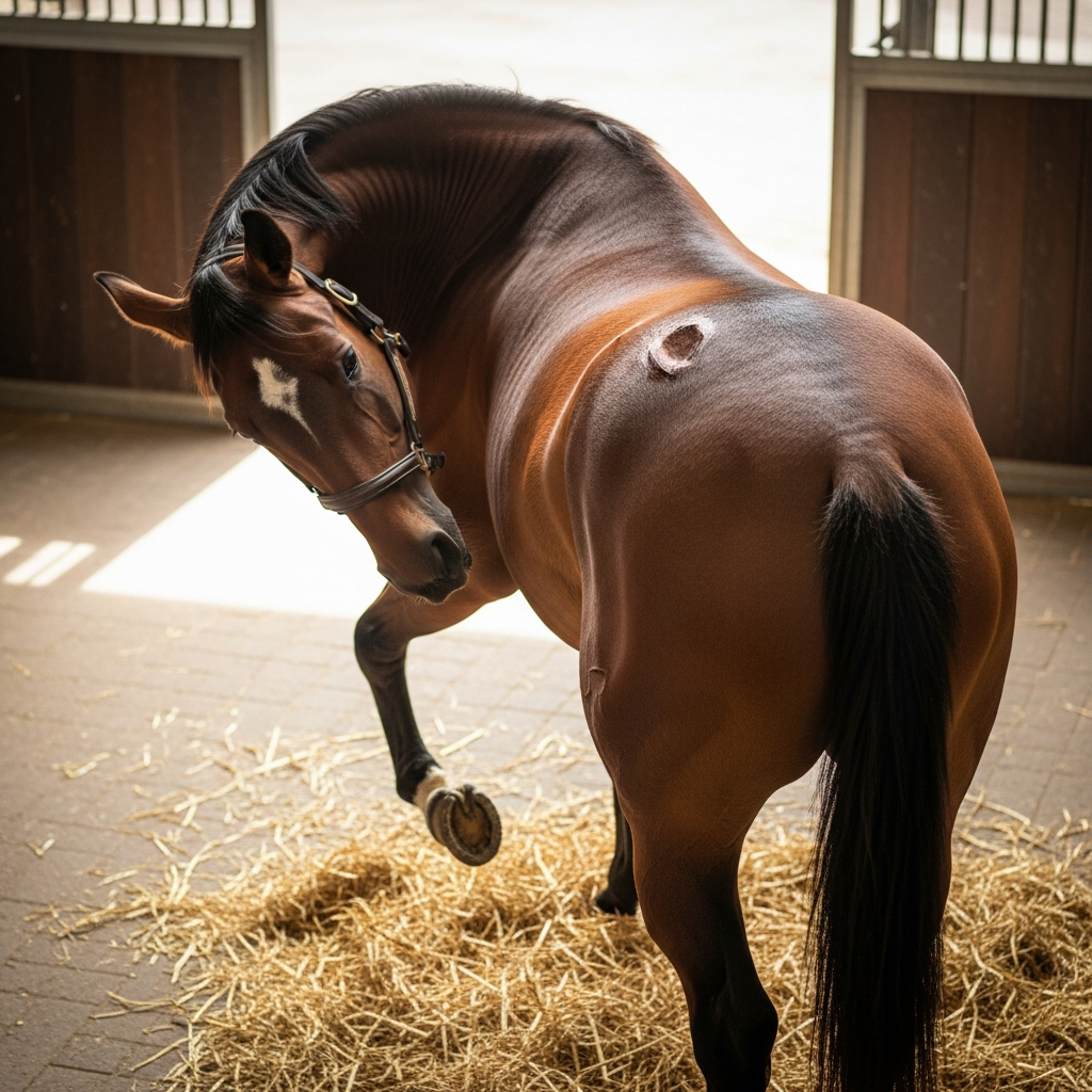 Le grattage du sol avec les antérieurs constitue l'un des premiers signaux. Ce geste, différent du grattage habituel avant le coucher, est plus nerveux et insistant. Le cheval peut également adopter la position "chien assis", s'étirer comme pour uriner sans y parvenir, ou tourner en rond dans son box.